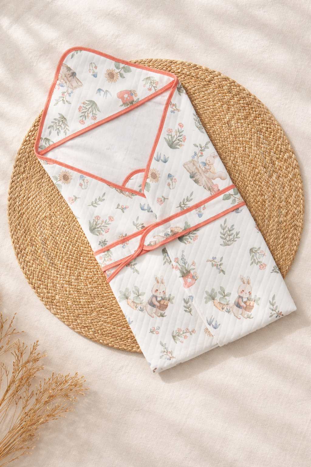 Premium Muslin Hooded Baby Wrap – Floral Bunny Garden Print